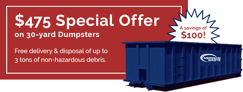 This special is $475 for one 30-yard container and up to three (3) tons of non-hazardous C&D debris disposal. Price includes free delivery, and all environmental and fuel fees. Tonnage rates of $62 apply for weights greater than 3 tons.